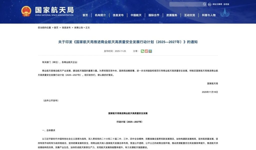 In November 2025, the China National Space Administration (CNSA) officially issued the Action Plan for Promoting High-Quality and Safe Development of Commercial Space (2025-2027). This plan explicitly incorporates commercial space into the national overall space development strategy and, for the first time, proposes establishing a dedicated Commercial Space Department to manage the regulation